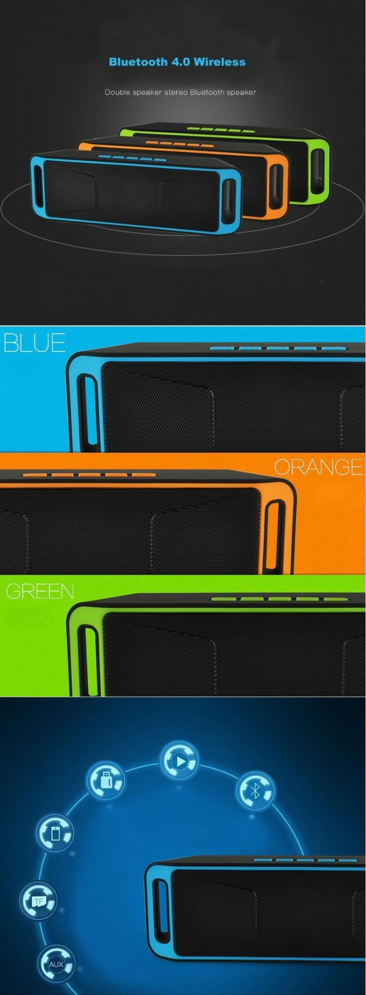 Kết nối âm thanh thông quoa bluetooth từ tất cả các loại diện thoại,máy tính...trên thị trường Công suất: 6w Hệ thống loa: 3 loa...