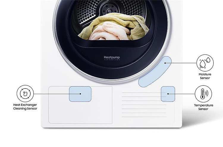 Cảm biến Nhiệt độ: Tự động điều chỉnh nhiệt độ trong lồng sấy, giúp bảo vệ chất liệu, phom dáng, màu sắc áo quần.