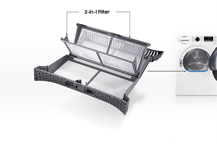 Với thiết kế Bộ Lọc 2 Trong 1 gồm hai lớp lưới lọc đa năng, Máy sấy Heatpump Samsung 9Kg DV90M5200QW/SV gia tăng hiệu năng vận hành và duy trì khả năng sấy khô mạnh mẽ mà không cần đến màn lọc riêng cho Bộ Trao Đổi Nhiệt. Sẵn sàng vệ sinh sạch sẽ Bộ Lọc 2 Trong 1 bất cứ khi nào cần thiết với hai đèn báo tích hợp.