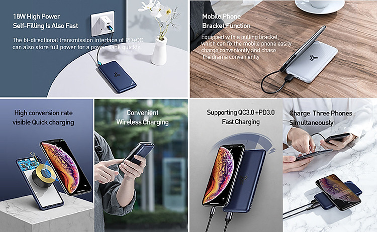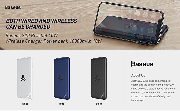 Pin sạc nhanh không dây Baseus S10 Wireless charge 10.000mAh được ứng dụng công nghệ sạc nhanh hiện đại nhất hiện nay, thiết bị tương thiết hầu hết với mọi thiết bị công nghệ như Smartphone / Tablet Android cho đến iPhone / iPad.